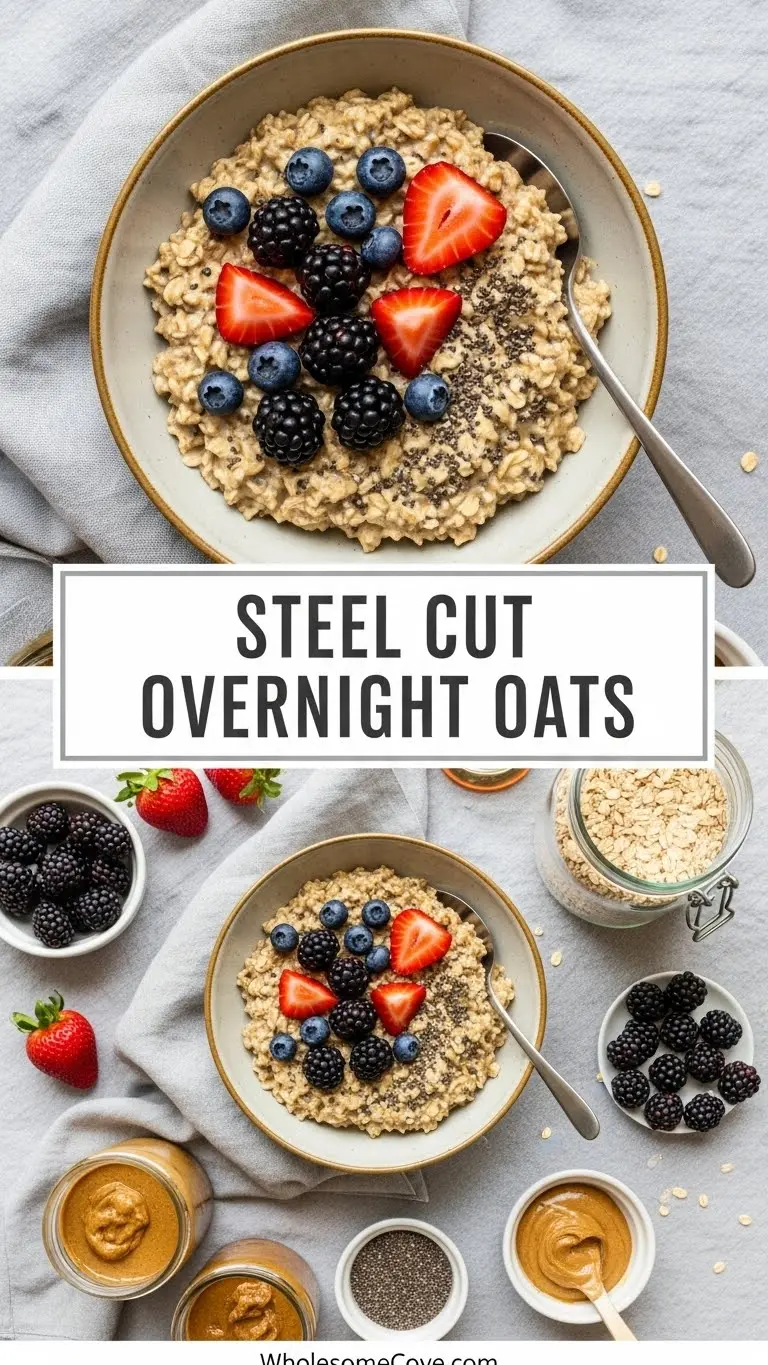 This steel cut overnight oats recipe creates perfectly chewy, creamy oats with no cooking required. Meal prep friendly and customizable with your favorite toppings.